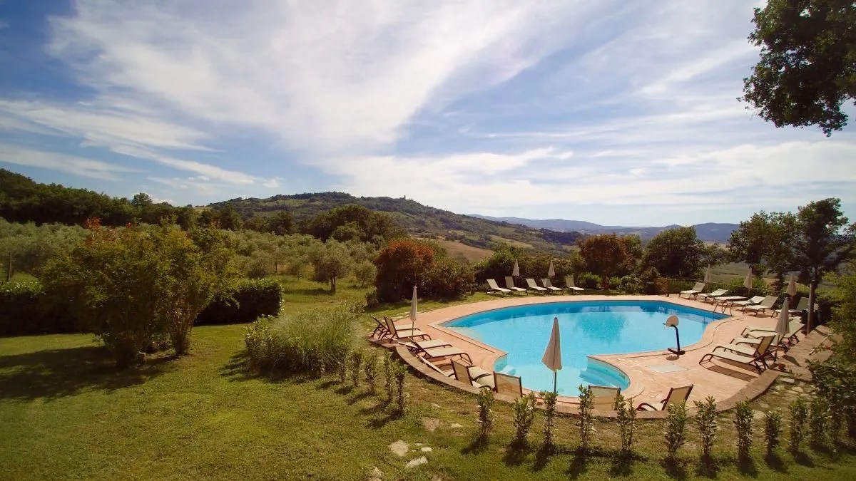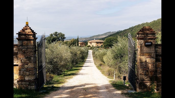 The property features expansive grounds, sweeping valley views, private terraces, and peaceful walking paths surrounded by nature. Guests can enjoy a large swimming pool, shaded outdoor lounges, gardens, communal spaces for gathering, and beautifully renovated rooms designed with rustic Tuscan character.